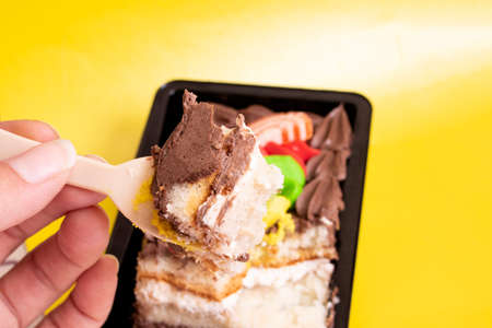 Hands taking chocolate cake with spoon and small cup coffee on dark table.