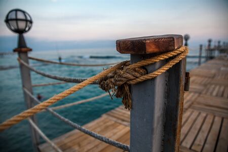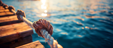 A close-up of a nautical rope knot on a wooden pier during a golden sunset. Clear details and vibrant colors ...