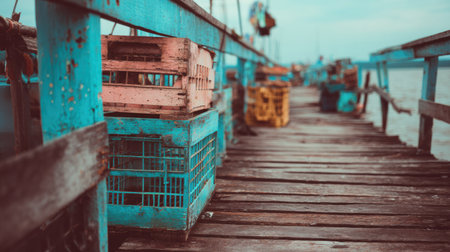 Fisher village boardwalk features colorful octopus crates amid a tranquil atmosphere, evoking nostalgia and maritime charm.