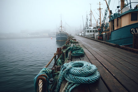 Fishing trawlers moored along a wooden dock during a misty morning, with coiled ropes and nautical equipment creating a moody, atmospheric harbor scene
