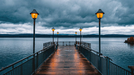 A wooden pier extends into a tranquil lake, illuminated by several street lamps. The overcast sky casts a muted light across the scene, where the calm water reflects the cloudy atmosphere. The composition emphasizes the leading lines of the pier. This image could be suitable for various uses, including editorial and commercial applications.
