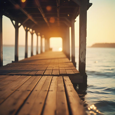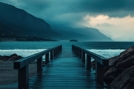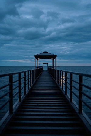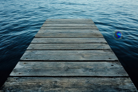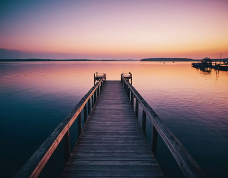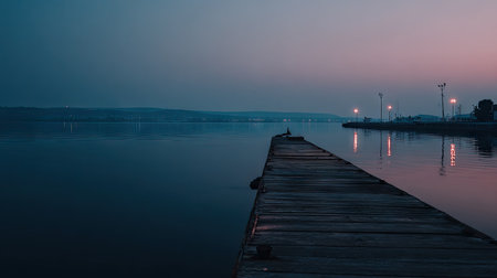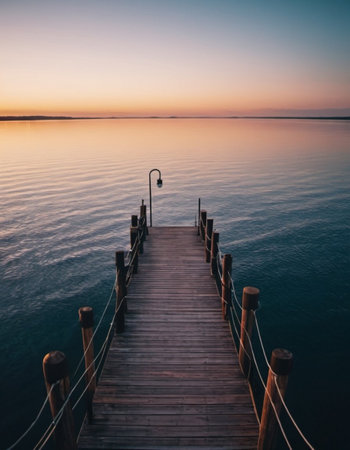 A wooden pier stretches into tranquil water under a dusky sky. Soft lighting illuminates the scene, casting reflections on the water's surface. The composition evokes a sense of peace and solitude. Suitable for illustrating travel, nature, or contemplative themes in various commercial and editorial projects.
