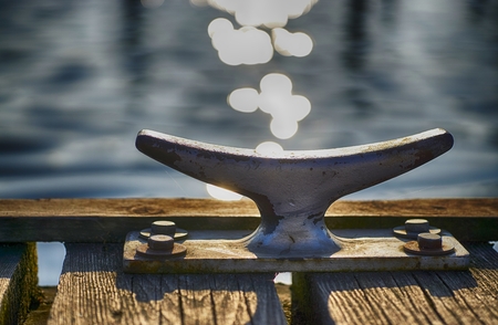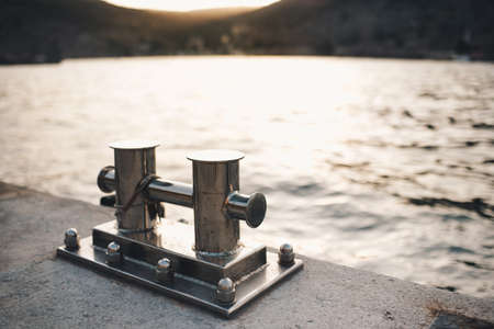 Metal bollard for boats and vessels on wharf over sea and sunset background close up. Maritime quayside with equipment for yatching at coastline. Travel season.
