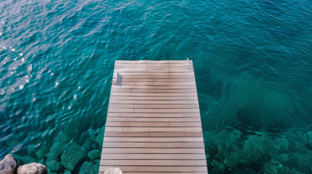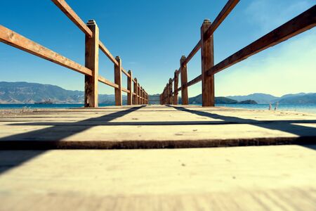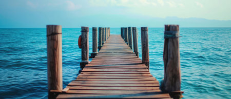 Perspective view of a wooden pier on the seashore with clear morning sky and sea with turquoise water.