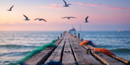 Sunset view of a wooden pier with seagulls flying over calm waters in a coastal setting