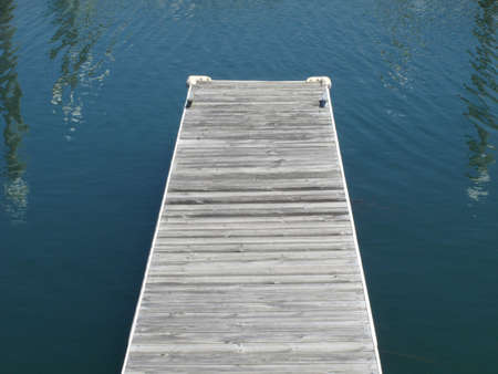 A wooden dock extends into a body of water, creating a pathway over the calm, reflective surface. The dock is surrounded by clear blue water, with no other structures in sight.