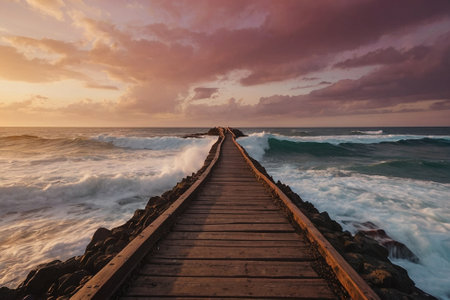 AI Generated. Rustic Wooden Planks Leading to a Calm Ocean at Sunset
