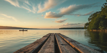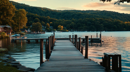 The tranquil dock emerges from the calm water as the sun rises, casting vibrant hues across the horizon. Morning light creates a serene atmosphere ideal for reflection. Generative AI.
