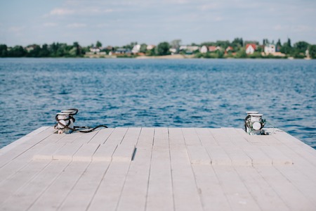 Wooden pier with bollard by the sea. Top view