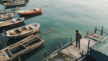 Generative AI : Aerial view of passengers boats docked at the pier along the Jordan river coastline Sea of Galilee Israel