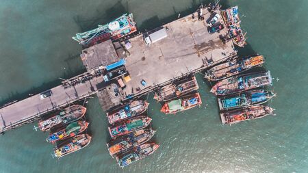 Top view from sky of group of wooden fishery boat at the sea marina with day lighting.