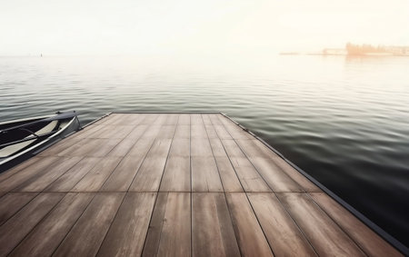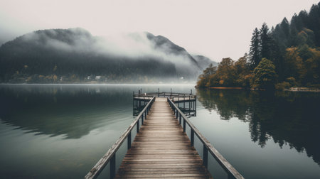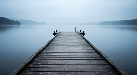 A serene wooden pier extends into still waters, enveloped in a gentle fog and soft sky. This tranquil scene offers a perfect retreat for reflection and relaxation.
