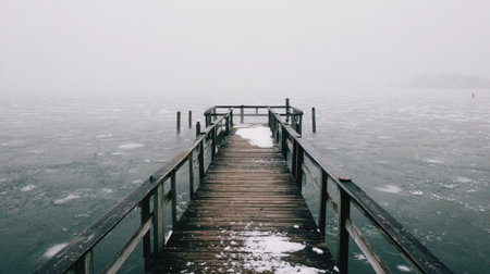 A tranquil wooden dock reaches out over a foggy lake, surrounded by ice and snow, capturing a serene mood perfect for evoking feelings of solitude and reflection.