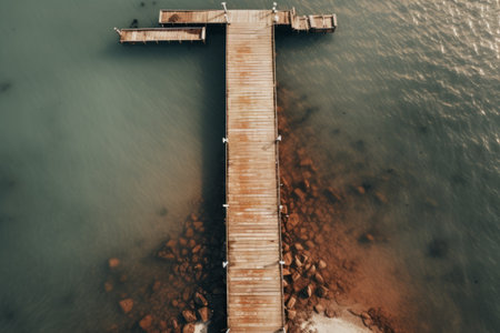 Serene Aerial Perspective: Tranquil Dock Embracing a Beige Water Expanse