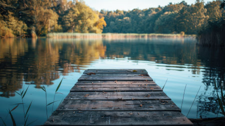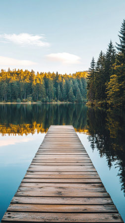 A tranquil scene of a wooden dock extending into a clear lake, surrounded by lush green forests and peaceful reflections. Perfect for nature enthusiasts.