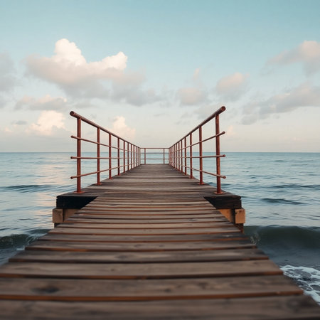 The wooden pier stretches out towards the tranquil sea, surrounded by a bright blue sky, inviting peaceful reflection at sunrise.