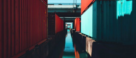 A vibrant display of shipping containers stacked in a container yard, showcasing the interplay of color and industrial structures while emphasizing logistics and transport.