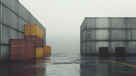 This image captures a somber industrial setting, featuring colorful shipping containers arranged in a misty, wet environment, creating an atmospheric depth.