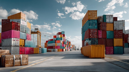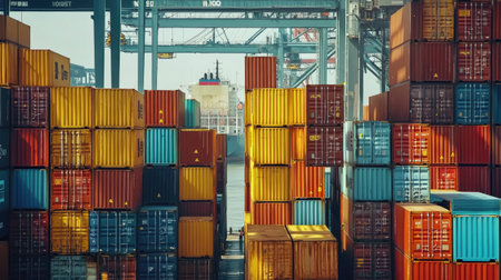 Towering stacks of shipping containers in various colors at a busy port, with cranes and cargo ships in the background.