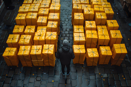 A lone courier stands facing numerous yellow-wrapped parcels neatly arranged on a rain-soaked cobblestone street. the scene complexities of urban logistics and the dedication to timely delivery amidst challenging weather conditions. Generative AI