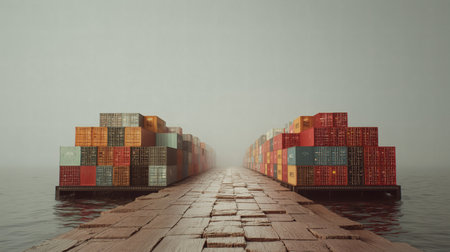 A serene yet expansive view of a wooden pathway leading to a misty horizon, flanked by towering stacks of colourful shipping containers on calm waters, symbolizing global trade, logistics, and supply chain.