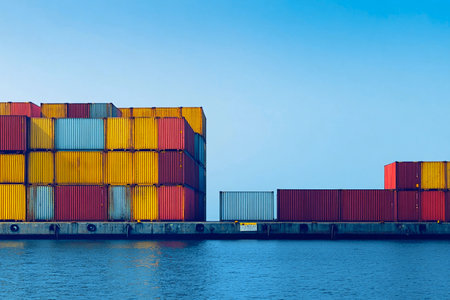 A striking view of brightly colored cargo containers stacked at a bustling port, under a clear blue sky, showcasing the dynamic nature of global shipping and trade.
