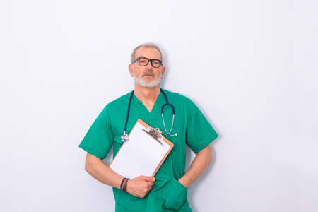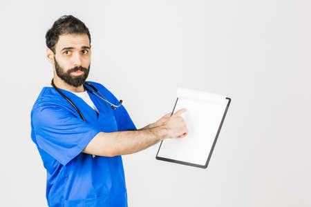 Portrait of male doctor with stethoscope in medical uniform holding a white paper, upset posing on a white isolated background