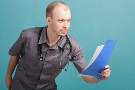 young male doctor holding a folder with papers on blue background