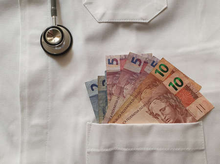 Brazilian money in the bag of a white fabric gown and stethoscope