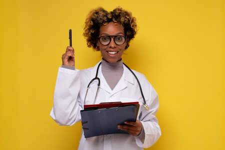 Afro American female doctor, twenty-seven years old, in a white coat, with a phonendoscope, writes a pen into a folder for papers. On a black background. Medical history. Medical concept, black skin young doctor woman, holding a folder, healthcare.