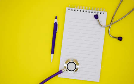 Stethoscope, notepad and pen on yellow background with copy space. Medical flat lay.