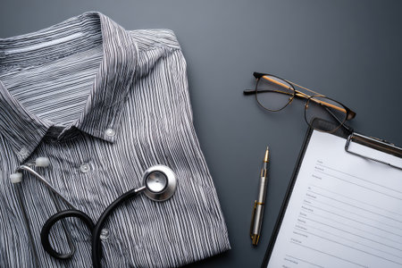 Overhead flat lay view of a striped shirt, stethoscope, eyeglasses, clipboard, and a pen arranged on a gray surface. The shirt is laid flat, with the stethoscope placed across the top of it. The eyeglasses rest on the gray surface, along with the clipboard and a pen, showing a collection of professional and medical equipment.