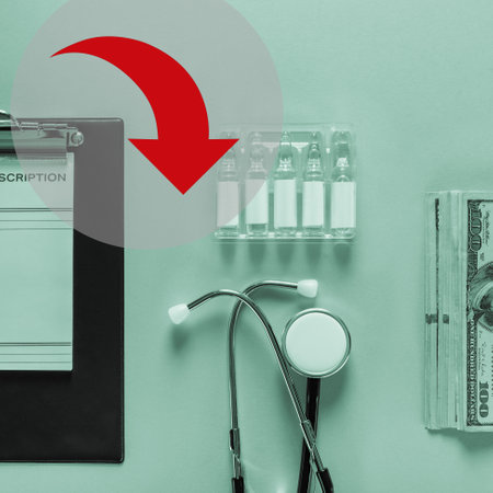 Doctors prescription, thermometer, stethoscope and ampoules lying near dollars money showing corruption in medicine concept in monochrome with green tinting and a red arrow