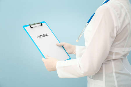 Female urologist with clipboard on color background, closeup