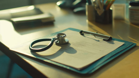 A well-arranged medical workspace featuring a stethoscope and clipboard, illuminated by natural light, creating a welcoming and professional atmosphere for healthcare activities.