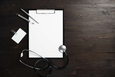 Stethoscope with clipboard and pen on desk, Healthcare and medical concept