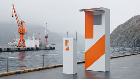 Modern podium, featuring geometric shapes in shades of white, orange, and gray, is situated on a waterfront in an outdoor setting. Industrial cranes and vessels are visible in the background, suggesting a port or harbor area.