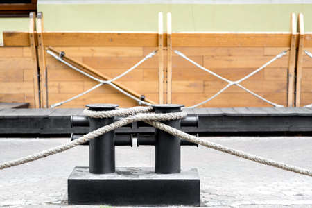 a decorative mooring bollard made of black iron tied with a rope into a marine knot, against the background of a building sheathed with wooden boards emitting the deck of a ship.