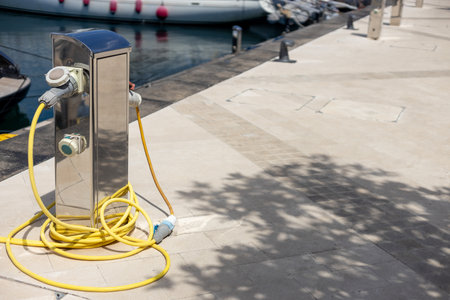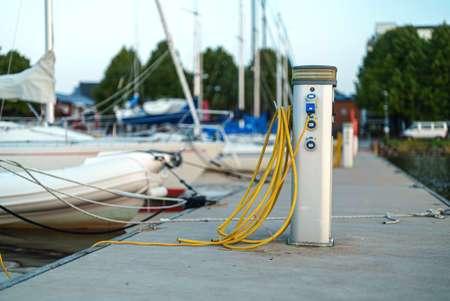 Charging station for boats. Electrical outlets for charging boats in the harbor on the pier by the sea.