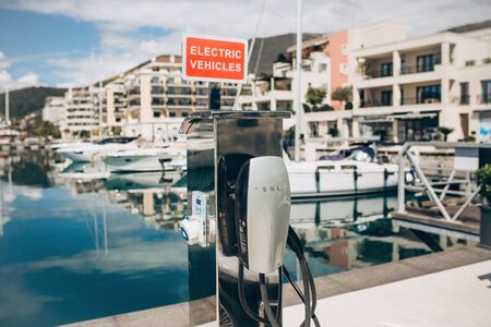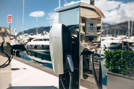 Montenegro, Tivat, April 9, 2019: Modern Tesla electric filling station in the port of Porto Montenegro for refueling electric cars and vehicles.