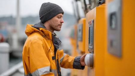 Closeup of a tugboat crew member interacting with a smart bollards control panel illustrating the userfriendly design and technology that aids in monitoring tug operations and maintenance