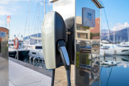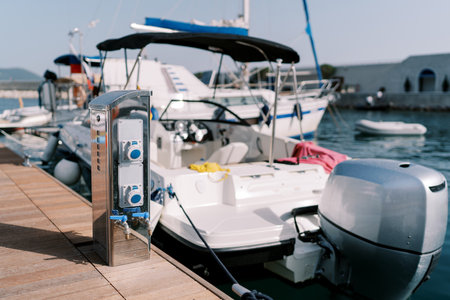 Electric charging station on the pier near a moored motor yacht
