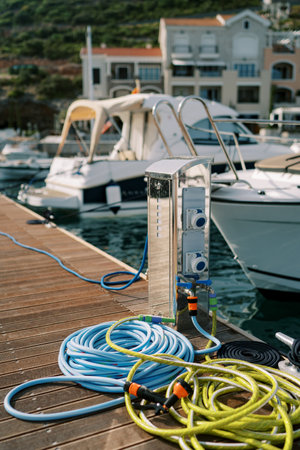 Coastal system for charging boat batteries and filling tanks with water. Station for refueling boats with water in the port. Electric panel for servicing and charging yachts