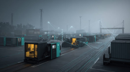 This image depicts a modern industrial port scene with shipping containers illuminated at night. Fog enhances the atmosphere while digital lines symbolize advanced connectivity and logistics.