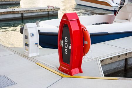 Lifebuoy ring on berth near the bollard with sea view of Marina Mariupol, Ukraine outdoors