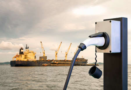 Electric station charger with plug and power cable supply and Large cargo ship for logistic import export goods anchor at sea in evening