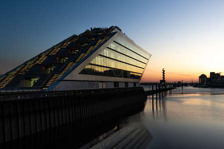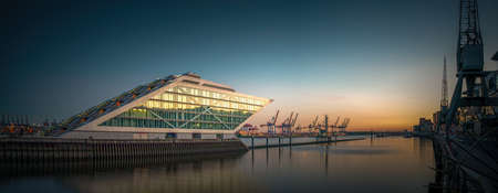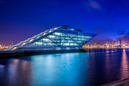 Hamburg, Germany: Harbor scenery at dusk. View to the office building Dockland in the district Altona