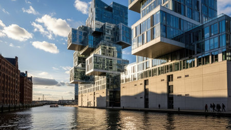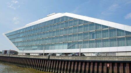 Office building in Hamburg and river same in the background photography of Hamburg district at Hamburg harbor in sunlight