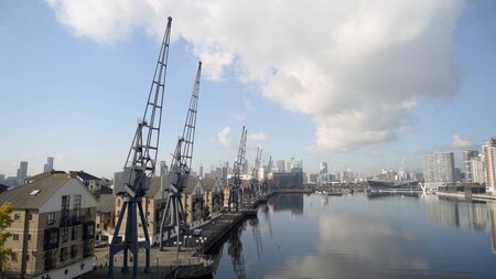 London / UK - 2020.10.17: Pitt cranes at Royal Victoria Dock, Docklands, East on cloudy Autumn day