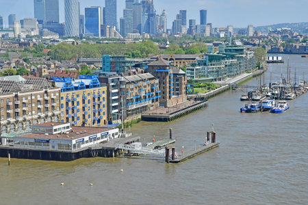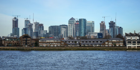 London, United Kingdom - February 03, 2019: View over river Thames on Canary Wharf, major financial district, with residential buildings in foreground.
